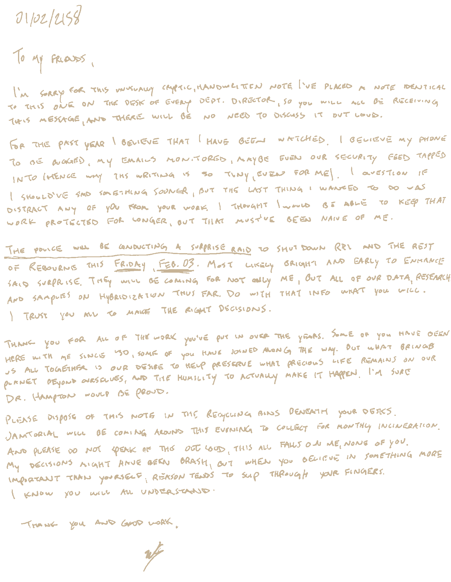 What has transpired here is nothing short of a state-orchestrated Even though our home’s future is unknown, know that what we accomplished here will not be forgotten, no matter how hard our oppressors try to make it so. Thanks to Ygress’s vision for what this world could be, we have made fundamental progress in altering the trajectory of plant life on this planet, giving it the tools it needs to survive the calamity that we have caused—that the people who are trying to stop it have caused. They will be relentless in their efforts, but unfortunately for them, Ygress’s patience and persistence rubbed off on all of us. What we’ve accomplished cannot be undone, and it’s only a question of when the work can continue, with or without us, here, or some place else entirely. Our research and breakthroughs live on in the
